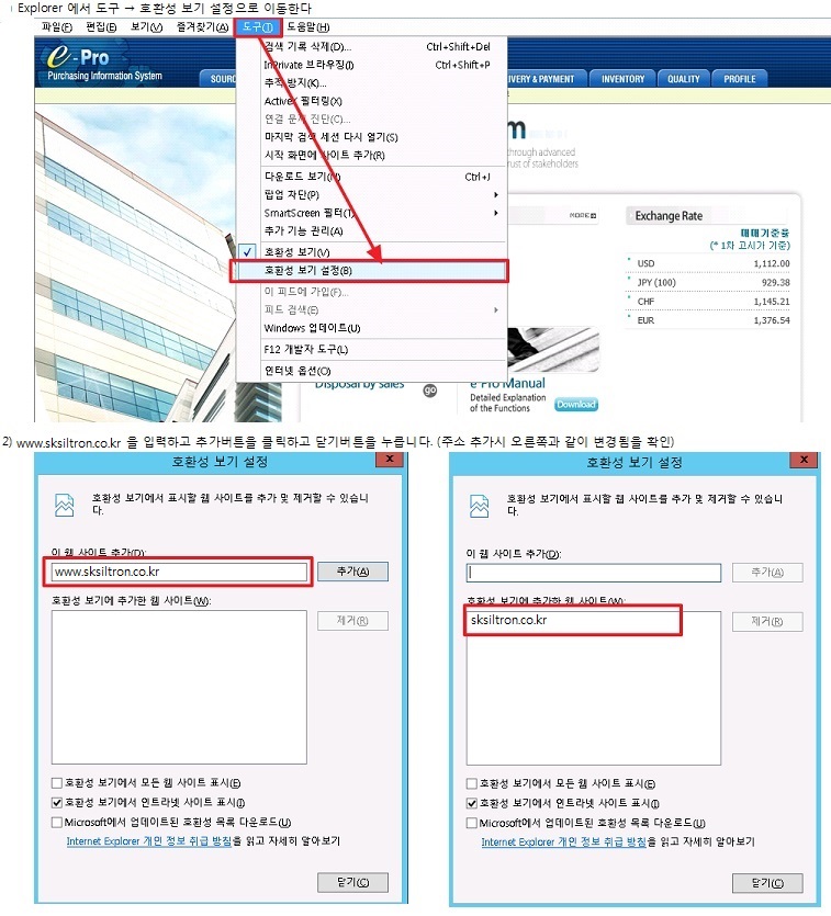 e-Sales, e-Pro 에서는 상위버전의 Explorer(10 이상) 버전에서 일부 기능이 제대로 동작하지 않을 수 있습니다.